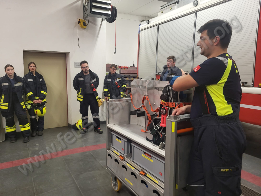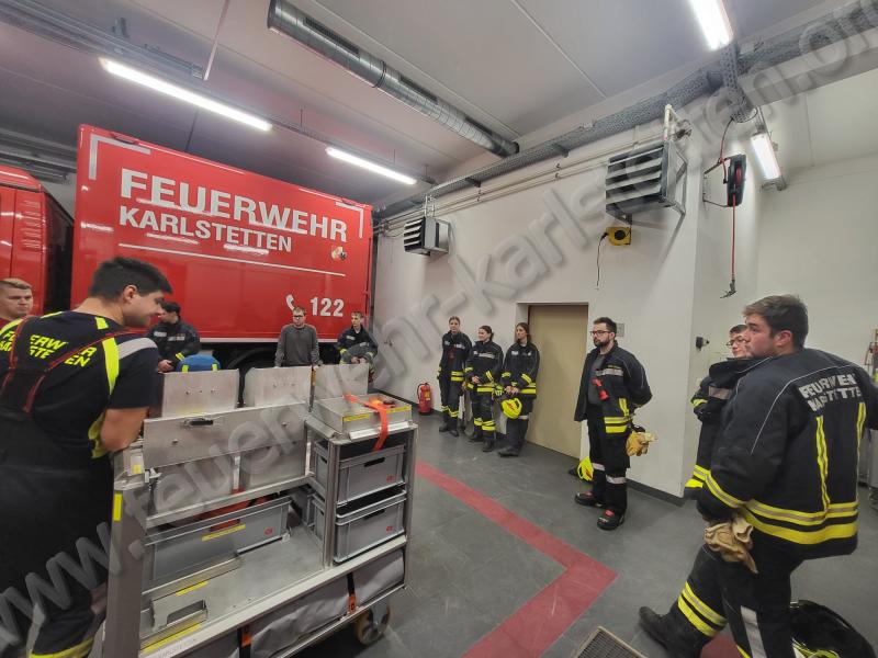 Zu Beginn wurden verschiedene Taktiken besprochen, wie eine Schlauchleitung im Atemschutzeinsatz optimal verlegt werden kann. Anschließend wurde einer unserer neuen Rollcontainer vorgestellt und dessen Aufbau sowie Einsatzmöglichkeiten erläutert. Danach wurden alle Geräte durchgegangen, die im Atemschutzeinsatz benötigt werden könnten. Dabei konnten viele Fragen geklärt und wertvolle Tipps für den praktischen Einsatz vermittelt werden.