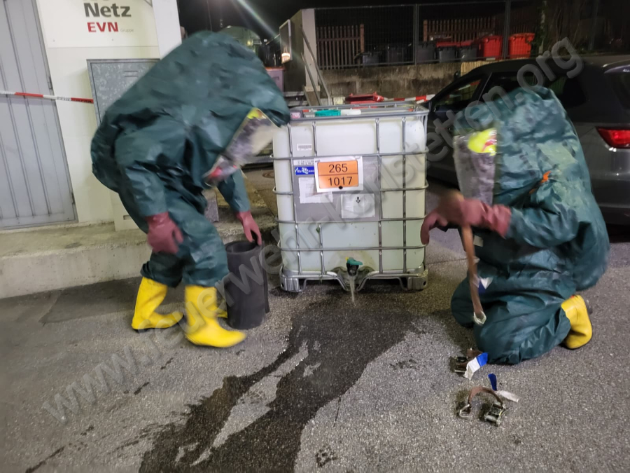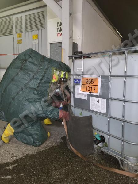 Im praktischen Teil der Übung rüstete sich ein Atemschutztrupp mit Schutzanzügen der Schutzstufe 2 aus, um die angenommene Leckage sicher erkunden und Maßnahmen zur Gefahrenabwehr einleiten zu können. Anschließend wurde besonders auf die Dekontamination der Einsatzkräfte geachtet, da sie bei Gefahrstofflagen einen wesentlichen Bestandteil der Einsatzabwicklung darstellt.