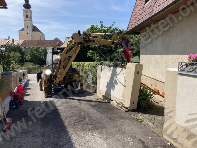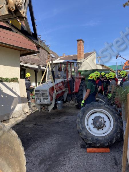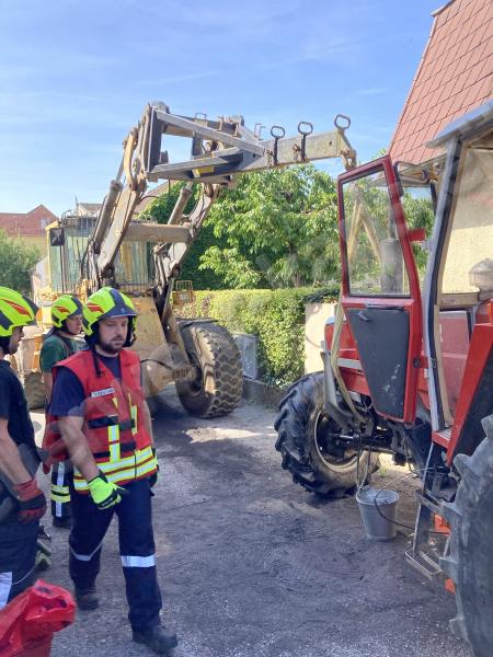 Nachdem Betonmauer und Traktor stabilisiert wurden, wurde die Bergung von Traktor und Vorderachse mittels Radlader durchgeführt. Anschließend musste die Zaunmauer aufgrund der Instabilität abgetragen werden.