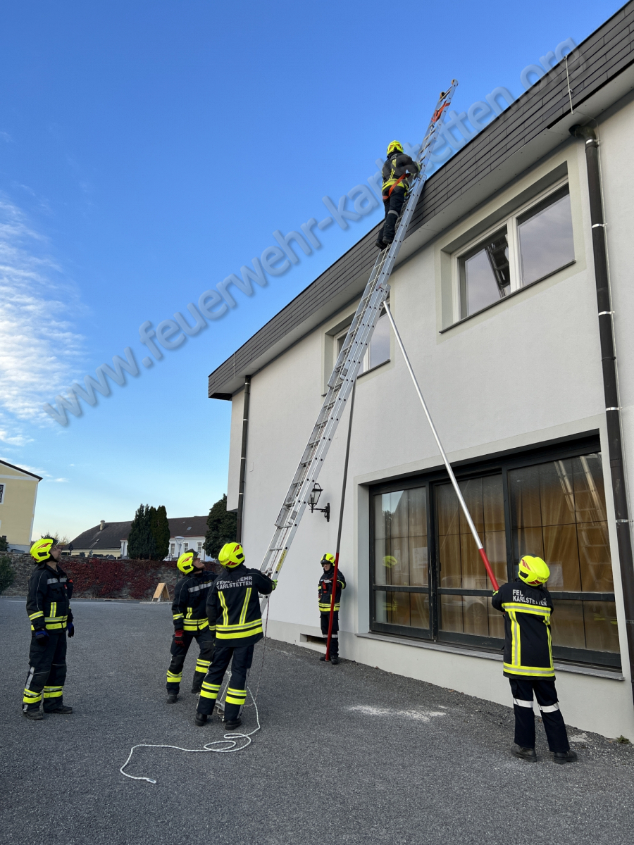 Am Nachmittag des 30.10. fand eine Übung beim ehemaligen Gasthof Kloiber statt. Das Gebäude befindet sich gerade im Umbau, es entstehen dabei 42 Wohnungen; eine Ordination und ein Verkaufsraum (Regionalladen) sind ja bereits in Betrieb. Die Wohnungen erstrecken sich dabei vom Kellergeschoß bis ins 2. Obergeschoß, also über 4 Stockwerke. Aus diesem Grund ist es für uns als Feuerwehr extrem wichtig im Einsatzfall Personen aus ihren Wohnungen retten zu können.